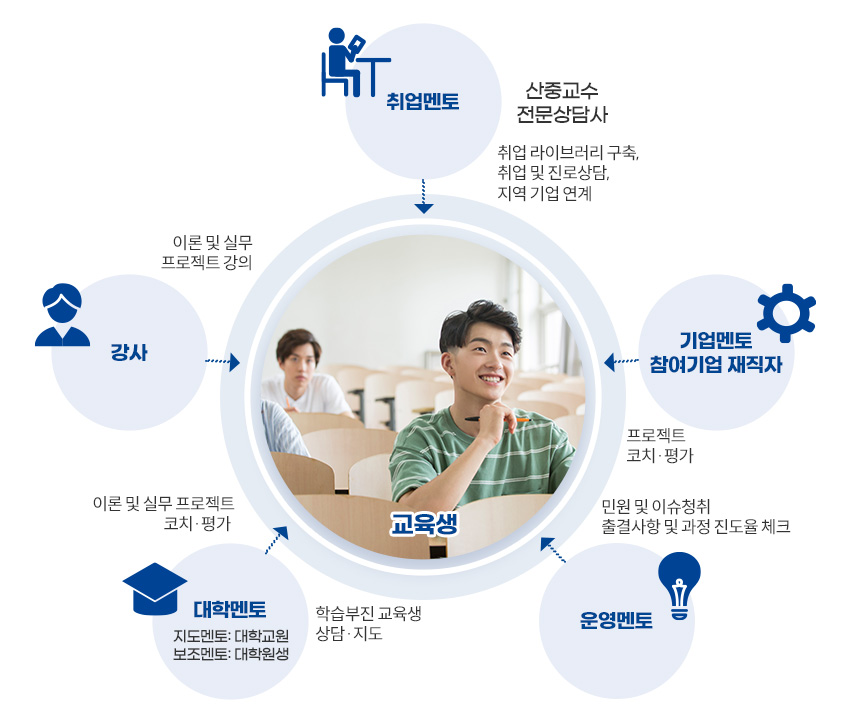 - 운영멘토: 학생 개인별 출결 사항 및 과정 진도율 체크, 대학·기업 멘토 연결