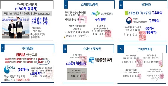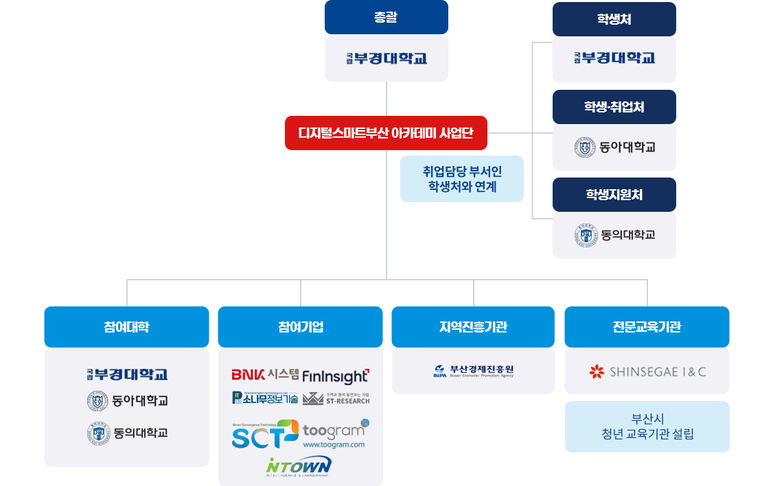 - 글로벌 디지털 대표기업 ㈜신세계아이앤씨, ㈜BNK시스템과 함께 지역의 대표 대학 부경대, 동아대, 동의대와 디지털 기업 6개사, 지자체 출연기관 부산경제진흥원이 부산의 디지털·스마트화를 이끄는 SW 인재양성을 위한 컨소시엄 구성