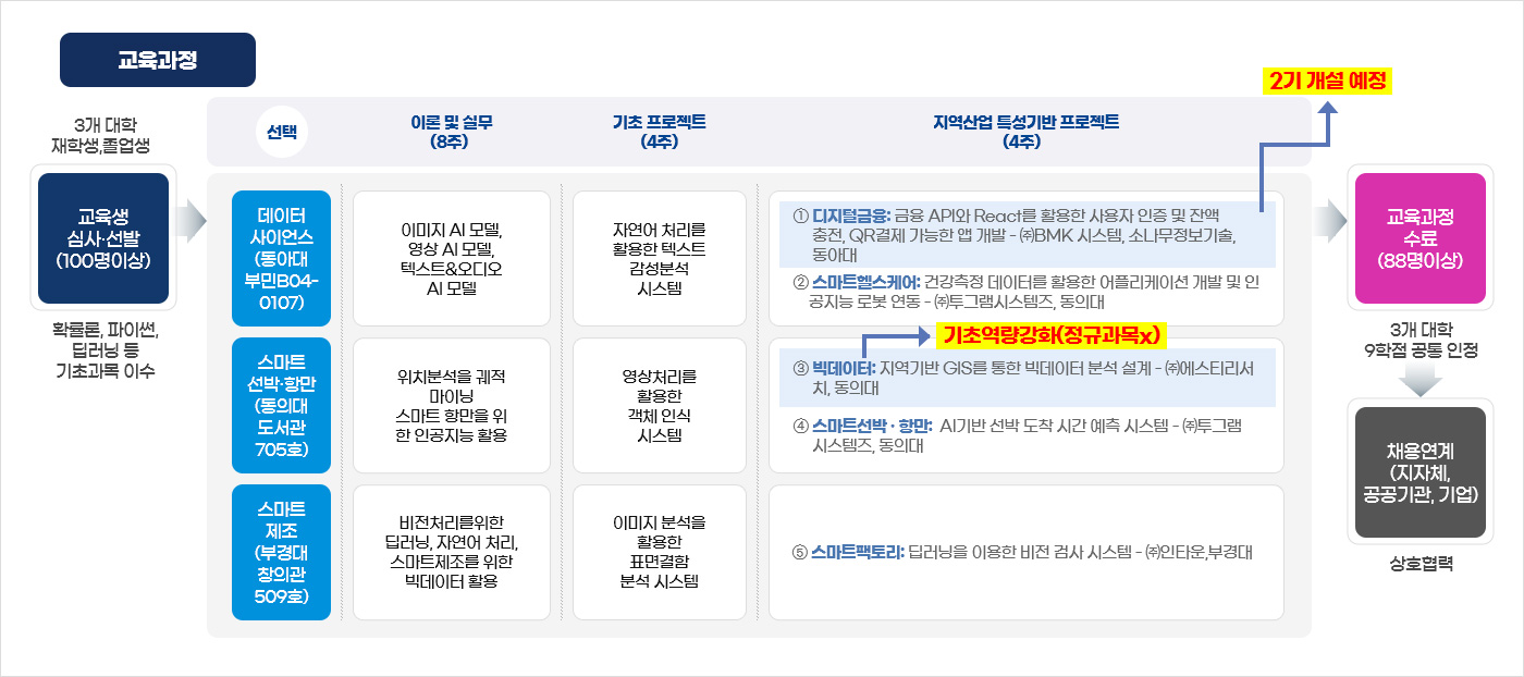 - 지역 선도산업인 ①금융, ②제조업, ③의료, ④해양·수산 산업의 디지털·스마트화를 위한 기업 수요기반 SW 전문인재 양성